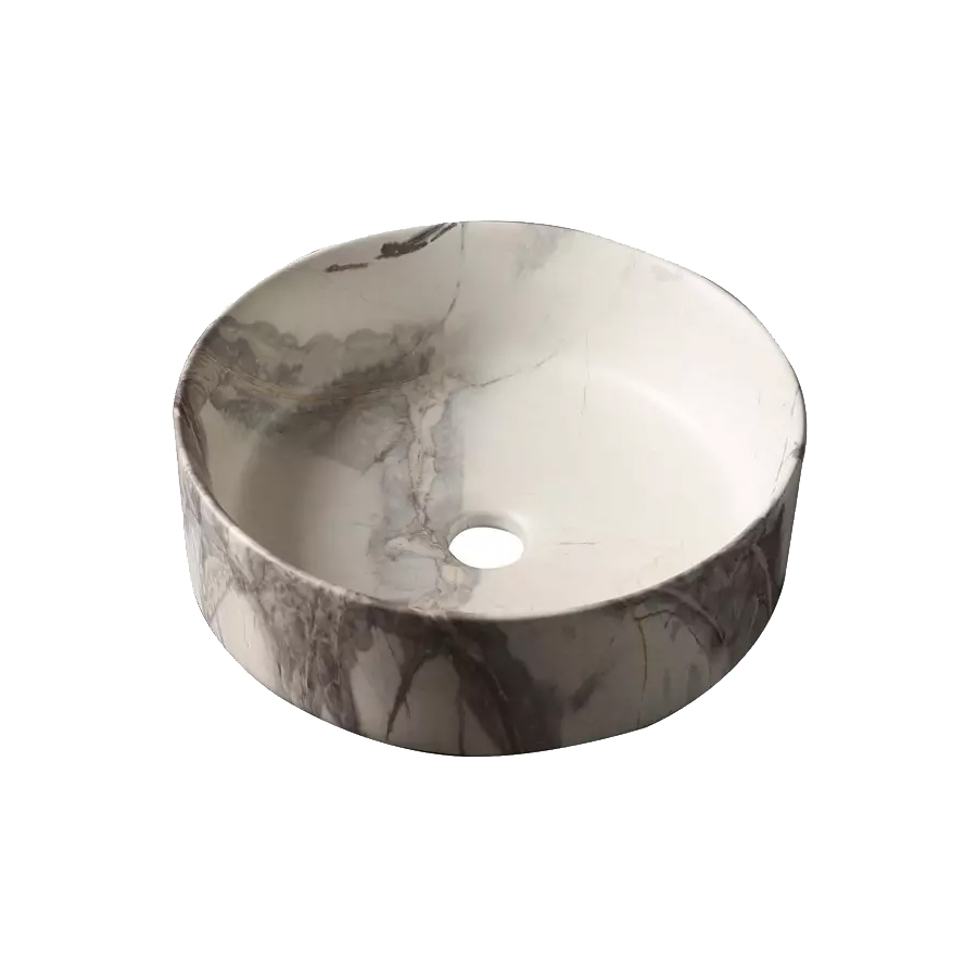 Diseño moderno y sofisticado. Esta bacha redonda efecto mármol blanco con vetas color gris y bordes delgados tipo “slim” es una pieza protagonista, ideal para baños de estilo lujoso, minimalista o industrial.