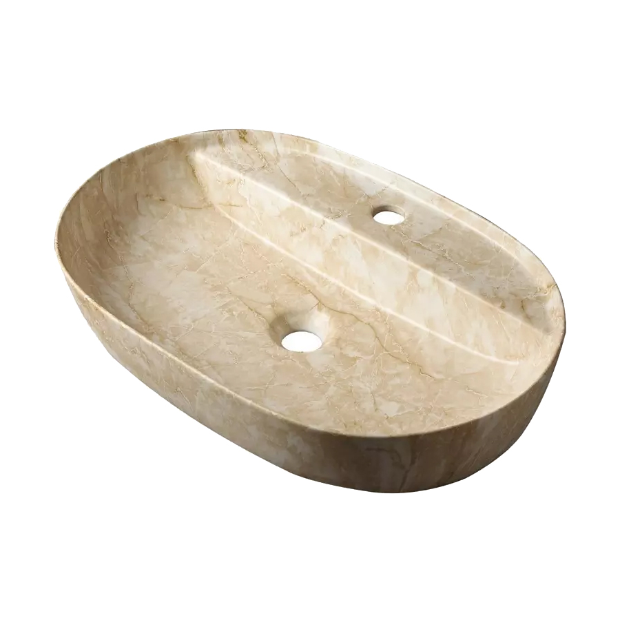 Elegancia cálida y textura natural. Esta bacha de apoyar combina el diseño ovalado con un acabado efecto mármol travertino en tonos arena, ideal para baños con estilo orgánico, rústico-chic o contemporáneo de inspiración natural.