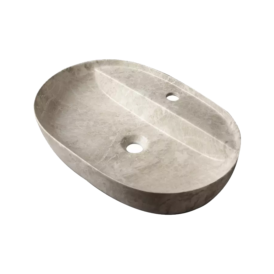 Elegancia cálida y textura natural. Esta bacha de apoyar combina el diseño ovalado con un acabado efecto mármol tundra en tonos girs, ideal para baños con estilo orgánico, rústico-chic o contemporáneo de inspiración natural.
